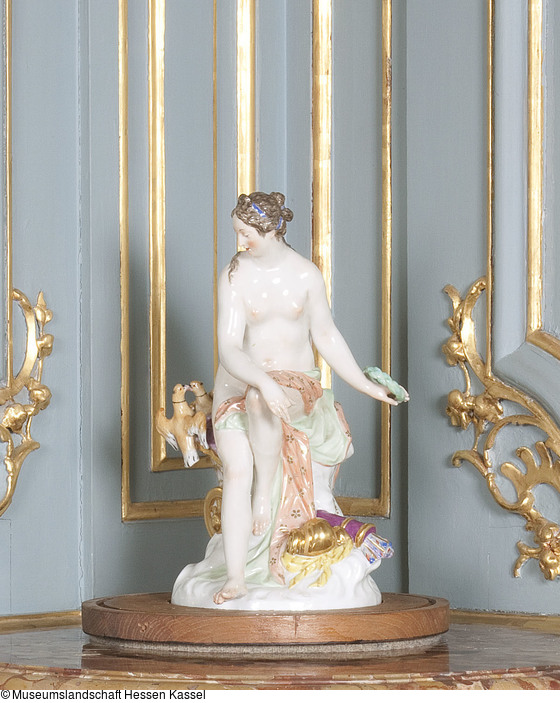 Früher auch Omphale genannt. Unten geschlossener flacher Sockel mit Ritzmarke K. 8. Venus sitzt auf den Wolken, halb auf dem zweirädrigen Muschelkarren. Hinter ihr schnäbeln zwei Tauben. Das rechte Bein ausgestreckt, sodass der Fuss über den Sockel vorsteht. Das linke Knie leicht angezogen. Mit der rechten Hand weist sie in der Richtung des Köchers, der zu ihren Füssen liegt, und der zunächst schwer verständlichen Volute, die von dem von Wolken verhüllten Wagen