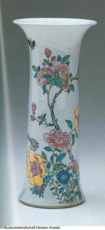 Über der Mitte Ansatzstelle deutlich zu erkennen. Durchgehender Blütendekor in verschiedenen Email: Grün, Rot, Gelb, Blau und Weiss, schwarze Zeichnung.