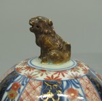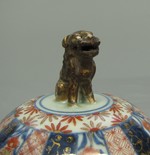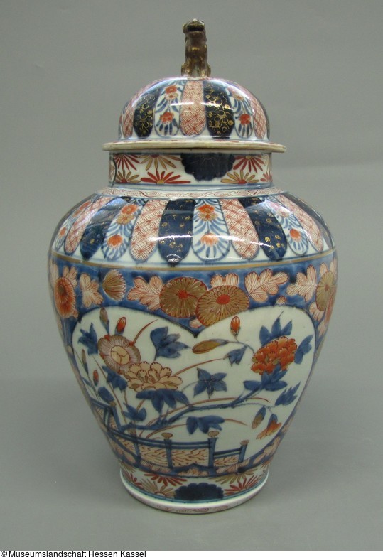 Typische Form der japanischen Deckelvase mit niedrigem Standring, gebauchtem Körper mit betonter Schulter, kurzem Hals, gewölbtem Deckel mit schmalem Rand und Fo-Hund als Knauf. Auf dem Standring das übliche eisenrote Spiralenornament. Darüber folgt auf eine blaue Doppellinie ein schmaler Dekorstreifen mit angeschnittenen Chrysanthemenblüten in Rot und Gold sowie blaue mohn-artige Blüten auf weißem Fond. Der größte Teil des Vasenkörpers ist in blauem Fond mit ausgesparten rot-goldenen Chrysanthemen und Blattwerk gehalten. Zwei große Fächerkartuschen auf der Vorder- und Rückseite lenken den Blick auf sich. Auf weißem Fond wachsen rotgoldene gefüllte Päonien mit blauem Blattwerk hinter einer Holzveranda mit blauem Geländer hervor. Das Pendant dazu ersetzt die Päonien durch blühende Prunuszweige. Eine einfache goldene und eine blaue Linie leiten über zu dem Schulterband. Auf weißem Fond liegen dicht nebeneinander unten abgerundete Streifen mit textilen Mustern, rote Swastika-Symbole und geometrische Motive neben rot-goldenen Blüten mit schmalen blauen Blättern und goldenem Blütendekor auf blauem Fond. Das Spiralornament des Standringes und das nachfolgende Chrysanthemenband schließen sich an. Der Deckel zeigt auf dem Rand das Chrysanthemenband, auf der Wölbung das Lamellenband der Schulter und wieder das Chrysanthemenband. Ein plastischer Fo-Hund dient als Knauf. Der Fo-Hund trägt die Farben Unterglasurblau, Braun-Aubergine und Eisenrot. Teil einer Garnitur aus drei Deckelvasen Inv.Nr. 4.1.1019 - 4.1.1021 und zwei Stangenvasen Inv.Nr. 4.1.935 - 4.1.936