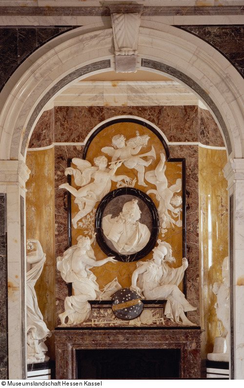 Hochformatiges Kaminrelief aus unterschiedlichen Marmorarten. Ikonographie: Profilporträt des Landgrafen als herrschaftlich-allegorische Tugenddarstellung.