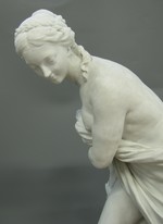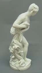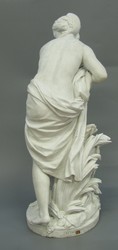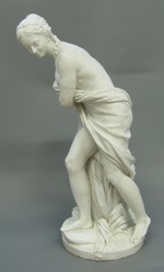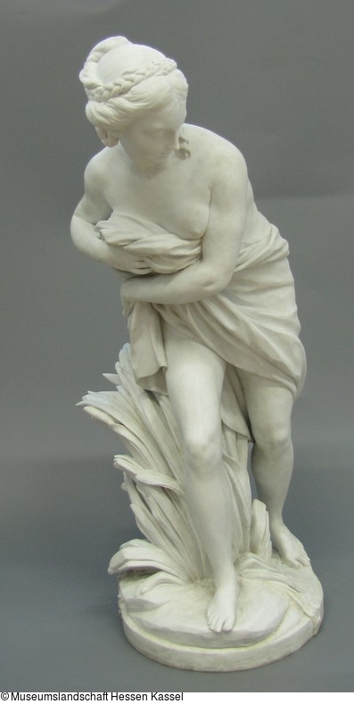 Auf einem naturalistischen, unregelmäßig geformten Sockel mit Ufersaum und Schilfpflanzen schreitende junge Frau, die nur mit einem Tuch um Hüfte und Bauch bekleidet als Badende gekennzeichnet ist. Linke Brust, Schulter und Beine entblößt. Das rechte Bein weit nach vorne ausgestellt, den Kopf leicht nach unten über ihre linke Schulter hinweg nach hinten geneigt. Mit beiden Armen umgreift sie ein Tuch. Hochfrisiertes, gescheiteltes Haar mit geflochtenem Kranz. Auf der Unterseite des Sockels fünf flache, in der Mitte miteinander verbundene Höhlungen. Auf der Unterseite in Rot ''Nro: 269'' ( wohl Modell-Nr. der Porzellanmanufaktur);
