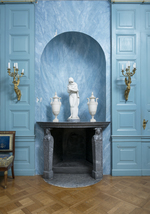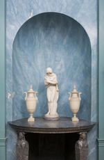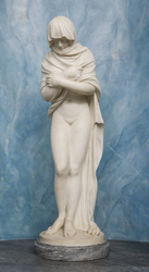 Allegorie des Winters in Gestalt eines stehenden jungen Mädchens. Runder, gekehlter Sockel aus grau-weißem Marmor. Darauf runde Plinthe. Das Mädchen mit nacktem Unterkörper, leicht vornüber geneigt, die Arme kreuzförmig vor die Brust genommen. Sie raffen einen bodenlangen, mantelartigen Überwurf, der um Kopf und Oberkörper geschlungen ist, auch den rechten Arm bedeckt und hinter dem Mädchen herabfällt.