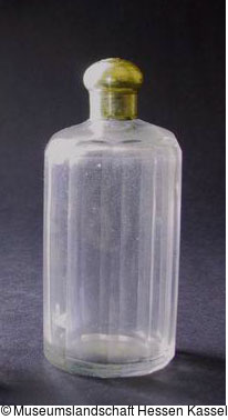 Kleine zylindrische Flasche aus klarem, farblosem Glas. Der Boden plan geschliffen. Flache Schulter mit engem, ungeschliffenem Hals. Die Mündung unbearbeitet. Die Wandung bis zur Schulter zehnfach facettiert. Der Deckel aus Silber, vergoldet, paßt mit zylindrischem Schaft exakt über den Halsansatz; nach oben als gedrückte Kugel gearbeitet, die im Scheitel konzentrische Kreise zeigt. Im Inneren des Deckels ein Gewindestift mit angeschraubtem Korken. Die Flasche gehört zu einer Reiseapotheke bestehend aus einer Prunkkassette, darin sich sechs Flaschen, ein Trichter sowie ein Becher befinden.