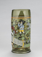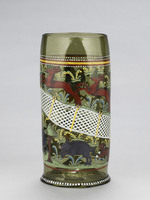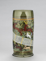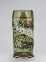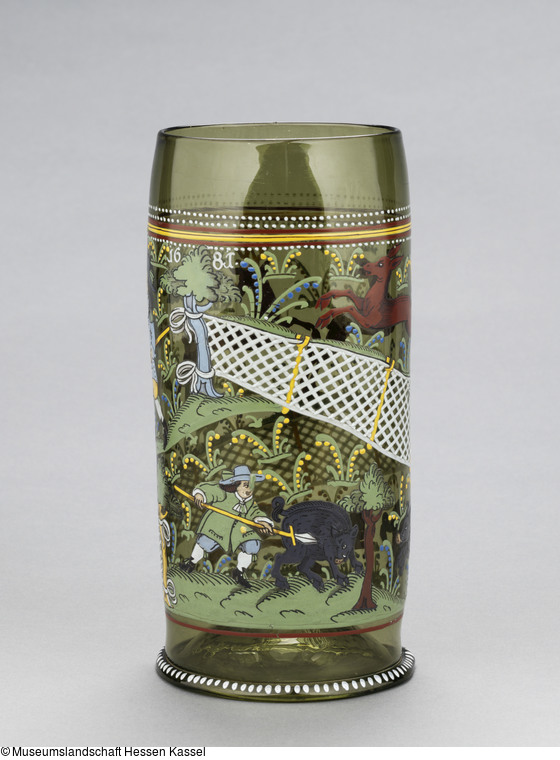 Der Humpen aus grünem Waldglas zeigt ein Jagdtreiben. Verschiedene Szenen werden dabei durch ein diagonal über die ganze Wandung des Glases verlaufendes Netz voneinander getrennt. Links unterhalb des Netzes ist die Jagd auf Sauen dargestellt. Zwei Hunde hetzen die Keiler, die am Ende von einem Jäger gestellt und mit der Saufeder erlegt werden. Die Szene oberhalb des Netzes zeigt hingegen die Hochwildjagd. Ein Jäger mit dem Jagdspieß treibt Jagdhorn blasend einen Hund an, der einen Hirsch und zwei Hirschkühe vor sich hertreibt.