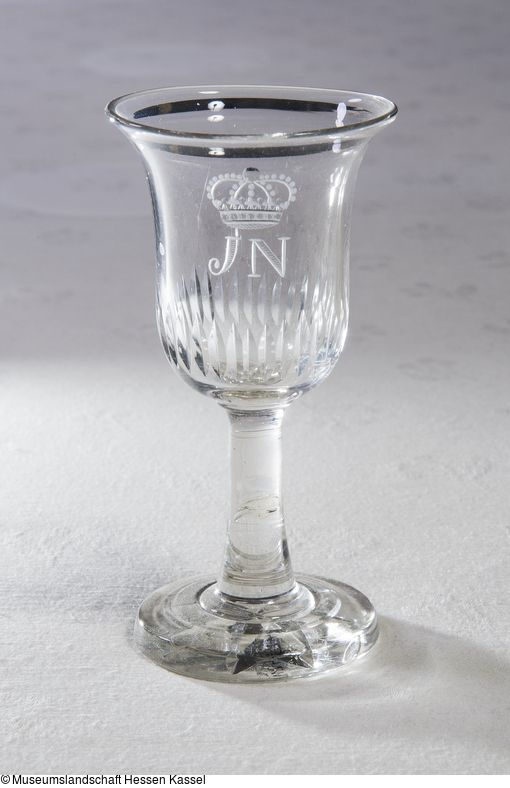 Bemerkung: Das Kelchglas gehört zu einer Gruppe Trinkgläsern mit den Initialen Jérôme Napoléons, die aus neun Kelchgläsern (4.2.110-4.2.112 und 4.2.1127 - 4.2.1132) und 10 Sektgläsern (4.2.106 - 4.2.109 und 4.2.1133 - 4.2.1138) besteht.