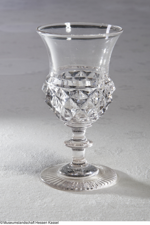 Kelchglas auf Scheibenfuß. Ausgekugelte Abrißnarbe. Auf der Unterseite des Scheibenfußes radialer Keilschliff. Kurzer Schaft mit Scheibennodus. Glockenförmige Kuppa, deren untere Hälfte mit umlaufendem Spitzsteinelschliff versehen ist. Abgesetzte obere Hälfte mit trichterförmiger Öffnung. Die Herkunft des Glases aus Schlesien ist möglich.