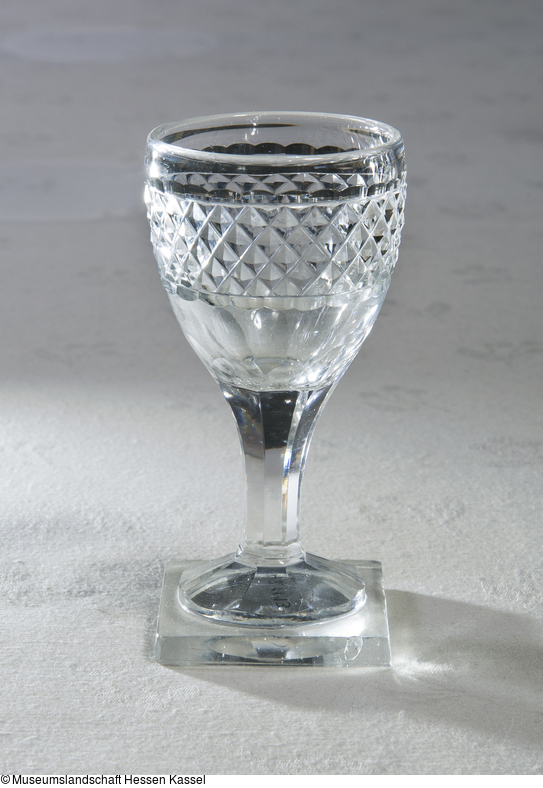 Kelchglas auf quadratischem Fuß. Ausgekugelte Abrißnarbe. Hoher achtseitiger Schaft, der fließend in die ovoide Kuppa übergeht und am Ansatz der Wandung in acht facettierten Bögen endet. Unterhalb des Lippenrandes breites Band mit Spitzsteinelschliff. Oben und unten Bogenschliff.