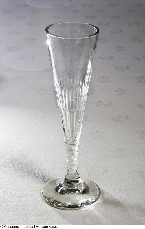 Leicht hochgewölbter, massiver Scheibenfuß. Schaft mit versetztem Facettenschliff, zur Kuppa hin konisch verbreitert. Kelchförmige, zweigeteilte Kuppa, das untere Drittel facettiert, durch Schnitt von der oberen Zone getrennt. Die obere Zone glatt, im unteren Bereich mit vertikalem Kerbschliff.