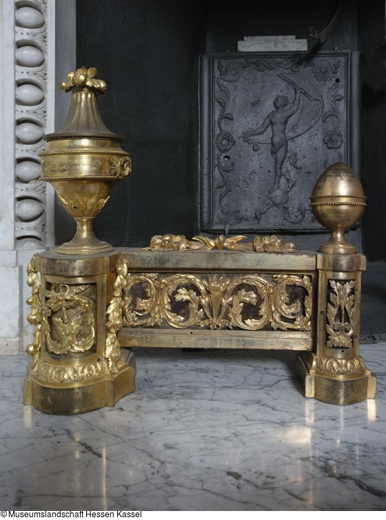 Zweiteilig, Eisen mit zwei vorderen Pyramidenhaltern, dazwischen zwei Vorblendestücke in Form einer kurzen Balustrade mit Eckpostamenten, auf denen Vasen stehen, die mit einem Blütenknauf schliessen. Als innerer Abschluß zwei eiförmige Vasen (Ei im Eierbecher).