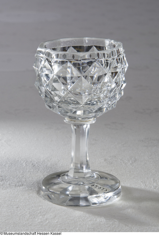 Pokalglas auf schwerem Rundfuß mit Sternschliff im Boden, facettierter Schaft, der von der halbkugeligen Kuppa durch einen Scheibennodus getrennt ist. Auf der Wandung umlaufender Steinelschliff. Lippenrand zehnfach facettiert.