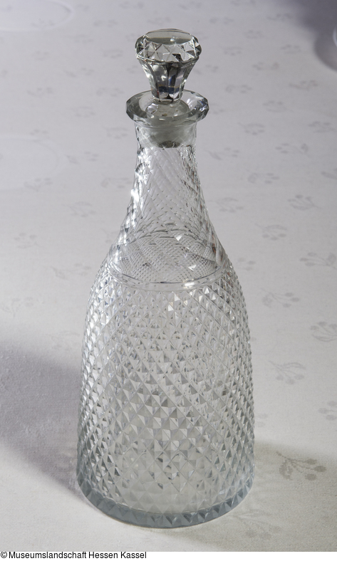 Hohe, kolbenförmige Karaffe mit Sternschliff im Boden. Am Fuß vertikaler Kerbschliff, auf der Wandung großflächiger Spitzsteindelschliff. Wabenförmig geschliffener Enghals, der in 10-fache Facettierung übergeht. Gekanteter Lippenrand. Flacher, kreisförmiger Stöpselknauf mit gezänkeltem Rand. Beidseitig der Handhabe kleinteiliger Spitzsteinelschliff im Kreisrund.