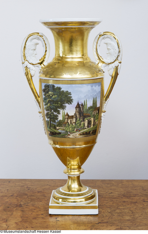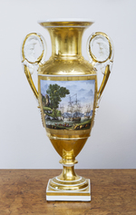 Hohe Amphorenvase auf quadratischer Plinthe. Hochgezogene Volutenhenkel mit Maskarons. Auf beiden Seiten der Wandung in rechteckigen Reserven großflächige Malerei mit Segelbooten in Küstengewässer bzw. Schloßansicht.