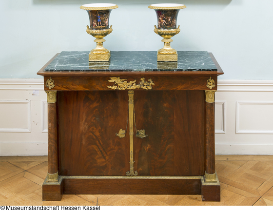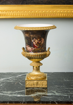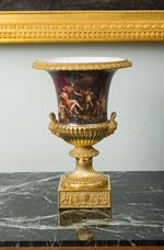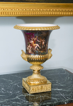 Kratervase auf quadratischer Plinthe mit Reliefdekor. Plinthe, Fuß, gerippter Bauch, Handhaben mit Maskarons sowie der Rand mit reicher Goldmalerei versehen. Auf der konkaven Wandung antikisierende Szenen in polychromer Malerei.