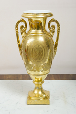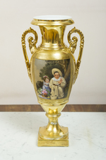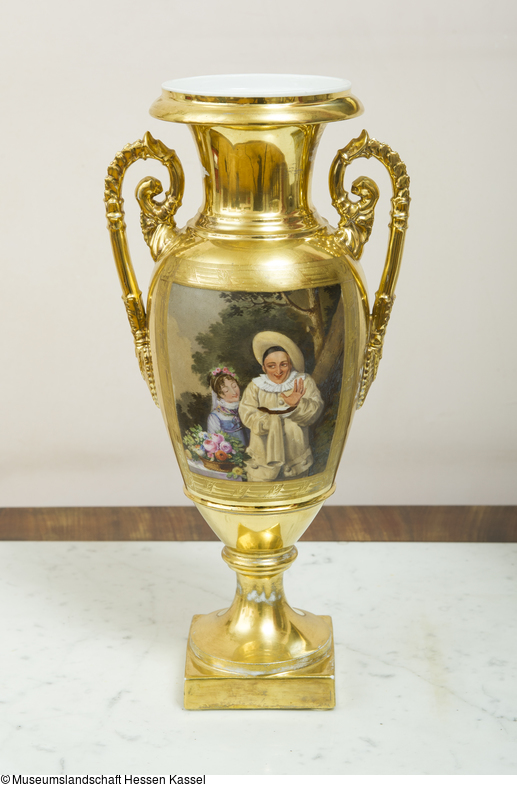 Hohe Amphorenvase auf quadratischem Sockel. Auf der Schauseite Pierrot mit einer Frau vor einem blumengefüllten Korb in Gartenlandschaft, rückseitig Lyra in einem Hochoval. Wohl aus einer Pariser Porzellanmanufaktur.