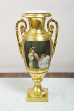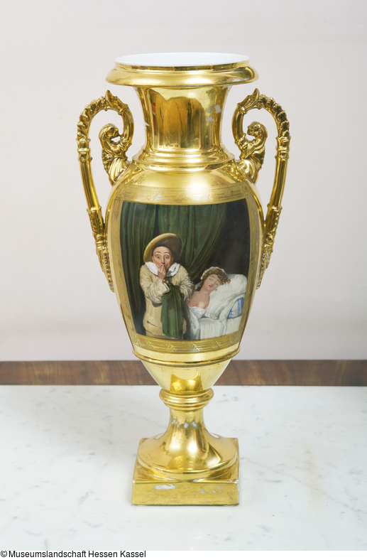 Hohe Amphorenvase auf quadratischem Sockel. Auf der Schauseite Interieurdarstellung mit Pierrot vor liegender Frau, rückseitig Lyra im Hochoval. Wohl aus einer Pariser Porzellanmanufaktur.
