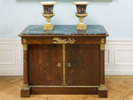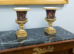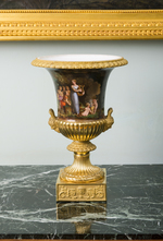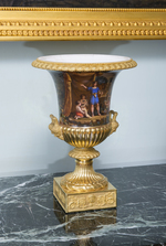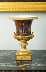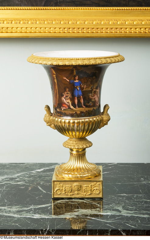 Kratervase auf quadratischer Plinthe mit Reliefdekor. Plinthe, Fuß, gerippter Bauch, Handhaben mit Maskarons sowie der Rand mit reicher Goldmalerei versehen. Auf der konkaven Wandung antikisierende Szenen in polychromer Malerei.