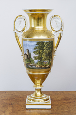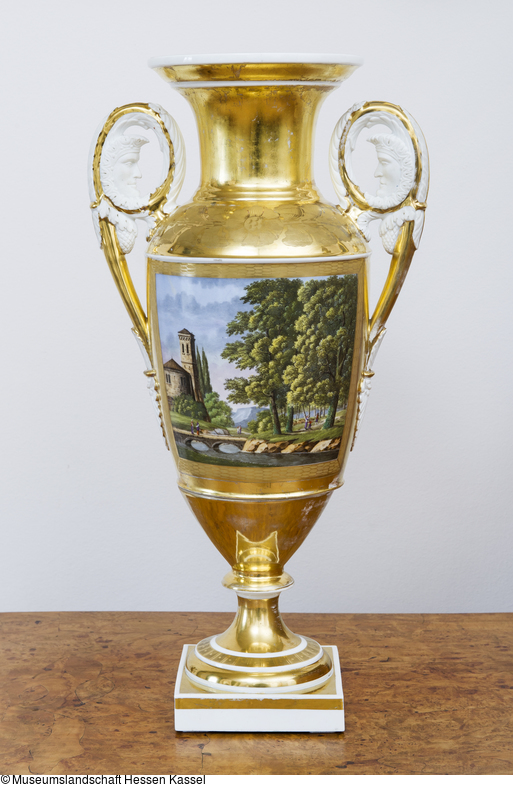 Hohe Amphorenvase auf quadratischer Plinthe. Hochgezogene Volutenhenkel mit Maskarons. Auf beiden Seiten der Wandung in rechteckigen Reserven großflächige Malerei mit Segelbooten in Küstenlandschaft bzw. Flußlanschaft.
