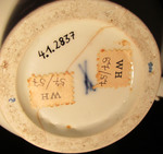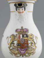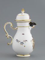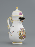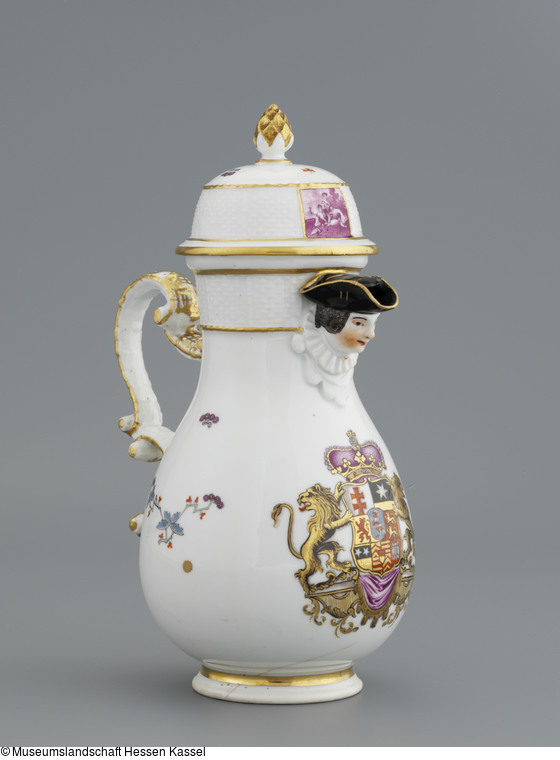 Kaffeekanne mit plastischem Männerkopf am Ausguß. Dreifach geschwungener C-Henkel. Haubendeckel mit Ananasfrucht als Knauf. Reliefdekor: Ozier. Auf der Schauseite unter dem Ausguß großes hessisches Landgrafenwappen. Seitlich indianischer Blumendekor.