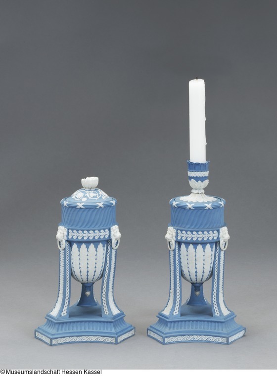 Ovoider Vasenkörper, der mit einem Dreifuß fest verbunden ist. Vase auf der Unterseite in einem plastischen Zapfen endend, darüber weißer Blattkranz. Oberteil der Vase mit S-förmig geschwungenen Kanneluren versehen. Deckel von zwei Seiten verwendbar. Eine Seite mit weißer pompeijanischer Ranke und Blütenknauf, die andere mit blattverziertem Kerzenhalter, der oben in plastischem Zungenfries endet. Dreifuß mit dreipassiger, profilierter Bodenplatte. Darauf drei konisch orientierte Bügel mit Blatt-, Flechtwerk und Löwenmasken an den oberen Enden.