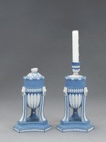 Jasperware. Blau durchgefärbtes, unglasiertes Steinzeug mit weißen Auflagen, sog. solid jasper ware.