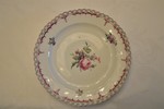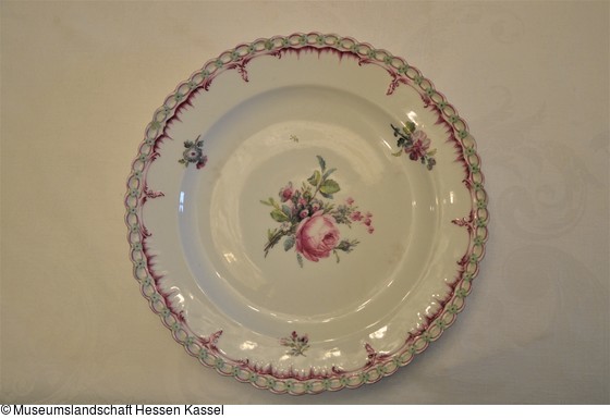 Flacher, runder Teller. Modellform: Königsglatt. Im Spiegel großes Blumengebinde, auf der Fahne drei kleine Blütenzweige.