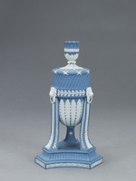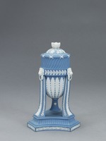 Ovoider Vasenkörper, der mit einem Dreifuß fest verbunden ist. Vase auf der Unterseite in einem plastischen Zapfen endend, darüber weißer Blattkranz. Oberteil der Vase mit S-förmig geschwungenen Kanneluren versehen. Deckel von zwei Seiten verwendbar. Eine Seite mit weißer pompeijanischer Ranke und Blütenknauf, die andere mit blattverziertem Kerzenhalter, der oben in plastischem Zungenfries endet. Dreifuß mit dreipassiger, profilierter Bodenplatte. Darauf drei konisch orientierte Bügel mit Blatt-, Flechtwerk und Löwenmasken an den oberen Enden.