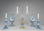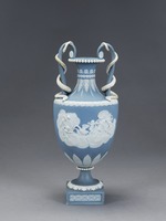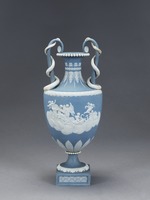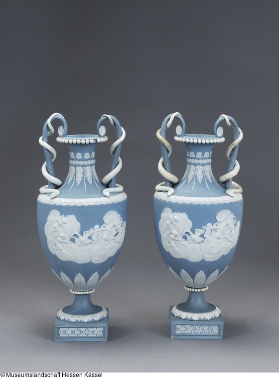 Amphorenförmige Vase mit Schlangenhenkeln auf quadratischer Plinthe. Beidseitig des Vasenkörpers weiße Auflagen, die einen von Schwänen gezogenen Muschelwagen mit Venus und Amor bzw. mehrere Putti an diesem Wagen ohne Venus zeigen. Über Fuß, Ansatz des Vasenkörpers, Schulter und Hals unterschiedliche Blattfriese. Am Lippenrand plastischer Perlstab.