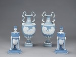 Jasperware. Blau durchgefärbtes, unglasiertes Steinzeug mit weißen Auflagen, sog. solid jasper ware.
