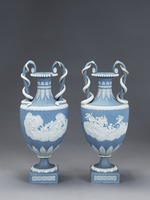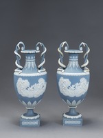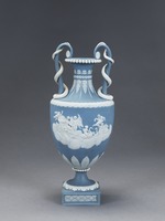 Jasperware. Blau durchgefärbtes, unglasiertes Steinzeug mit weißen Auflagen, sog. solid jasper ware.