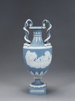 Amphorenförmige Vase mit Schlangenhenkeln auf quadratischer Plinthe. Beidseitig des Vasenkörpers weiße Auflagen, die einen von Schwänen gezogenen Muschelwagen mit Venus und Amor bzw. mehrere Putti an diesem Wagen ohne Venus zeigen. Über Fuß, Ansatz des Vasenkörpers, Schulter und Hals unterschiedliche Blattfriese. Am Lippenrand plastischer Perlstab.
