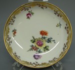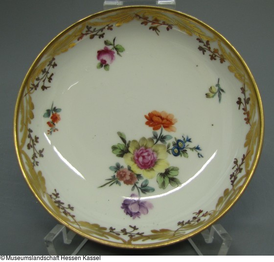 Schalenförmige Untertasse mit ausgestelltem Lippenrand. Standring. Im Spiegel ein Blumengebinde und Streublüten in polychromer Malerei. Goldrankenbordüre.