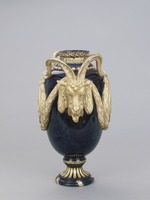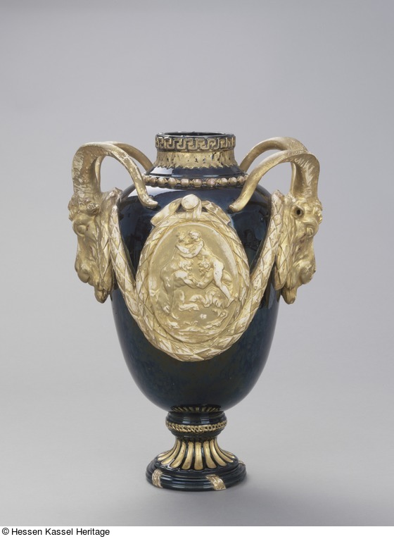Hoher ovoider Vasenkörper auf kanneliertem Trichterfuß. Enghals mit umlaufendem Perlstab, Blattkranz und Mäanderband im Relief. Beidseitig der Wandung große, von Lorbeerkränzen gerahmte Medaillons mit auf Satyrn sitzendem Liebespaar. Dazwischen große Steinbockköpfe als Handhaben. Reliefdekor kalt vergoldet.
