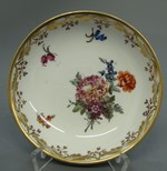 Schalenförmige Untertasse mit ausgestelltem Lippenrand. Standring. Im Spiegel ein Blumengebinde und Streublüten in polychromer Malerei. Goldrankenbordüre.