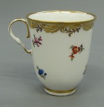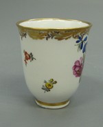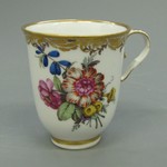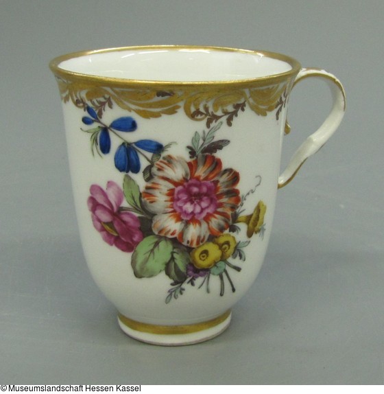 Glockenförmige Tasse mit Rocaillehenkel auf Standring. Auf der Wandung ein Blumengebinde und Streublüten in polychromer Malerei. Goldrankenbordüre und Goldränder.