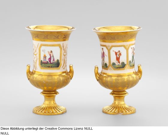 Kratervase auf kanneliertem Tricherfuß. Seitlich zwei Henkel. Auf der Schau- und Rückseite des Vasenkörpers insgesamt vier rechteckige Bildfelder mit abgekanteten Ecken. Darin je eine antikisierend gekleidete Frau u.a. Füllhorn oder Fackel haltend bzw. siebenzeilige Widmung: ''Gerechtigkeit erhält die Staaten,/ Heil, Hessen euch, Heil eurem Thron,/ Von ihr beschützt gedeih'n die Saaten,/ Die Wissenschaft find't ihren Lohn,/ Da Wilhelm euren Scepter führt,/ Dem Deutschheit hoch den/ Busen ziert.'' Polychrome Malerei, Golddekor.