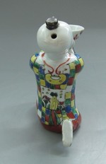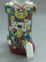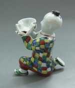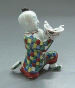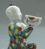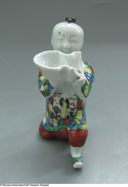 Das rechte Knie auf dem Boden, das linke Bein hochgestellt, in den Händen vierkantige oder schildförmige Schale. Bemalt in Eisenrot unter Glasur und Emaillefarben in Grün, Blau, Rosa, Gelb und Eisenrot über Glasur.