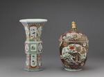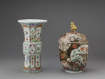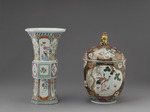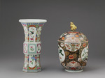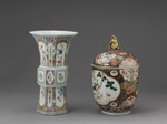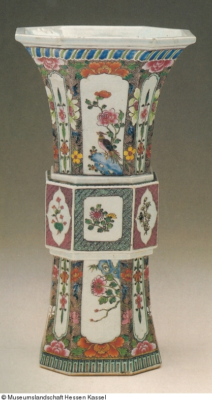 Offenbar wurde damit dem Verziehen im Brand vorgearbeitet. Die Bemalung unterscheidet zwischem einem niederen Sockelstreifen mit ausschliesslich ansteigender Bewegung in Blau, Türkis und Rosa, der mit gelber Wellenlinie abschliesst. Unterbrochen durch den Schaftstreifen ist nun das Gefäss zusammengefasst durch senkrecht laufende Felder mit geschwungenen Enden, die schmaler und breiter jede Seite mit Ausnahme der Ecken und Zwickelfelder füllen; in diesen Feldern auf weissem Grund freiere und durch senkrechte Reihung gebundene Blütenmuster in den breiteren Feldern Felsen mit Ranken und Vögeln, in den schmalen eine geometrisierende Reihung, die auch durch die Verwendung von Gold und Eisenrot abstrakter gehalten ist. Kanten und Randstücke mit kleinteiligem, bräunlich gezeichnetem Schuppenmuster bedeckt, von dem sich Blüten in Purpur, Eisenrot, Grün und Weiß, begleitet von blauen und grünen Blättern abheben. Als Gegenstück zu dem Sockelstreifen läuft über diesen Feldern, durch weiße Wellenlinien getrennt und durch weisse Schräglinien gegliedert, ein schmal und breit und blau und grün wechselndes Band.