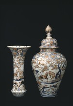 Porzellan, Unterglasurmalerei in Kobaltblau, Aufglasurmalerei in Schwarz, Eisenrot und Gold |