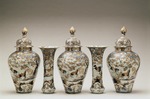 1 von 3 gebauchten Deckelvasen mit Hals. Kobaltblaue Unterglasurmalerei mit Eisenrot und Gold auf weissem Grunde. Darstellung von wilden, tobenden Pferden unter blühenden Bäumen. Vorhangfries mit Flächenmuster. Blühende Ranken an Hals- und Fussrand. Japan