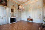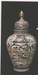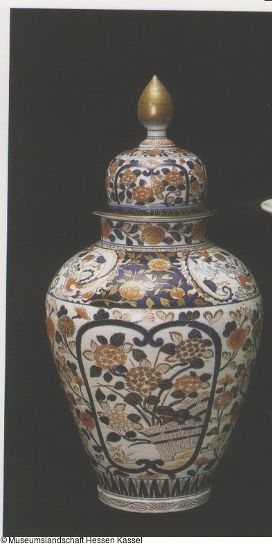 Ein rotes Spiralband liegt auf dem Standring. Die Gefäßwandung trägt zuunterst ein Band mit einer blauen Zickzacklinie, darin eingeschoben rote spitz zulaufende Ecken. Die Grundfläche der Hauptszene ist weiß gehalten. Um so leuchtender heben sich die locker aufgemalten rot-goldenen Chrysanthemen mit ihrem blauen oder goldenem Blattwerk von ihr ab. Unterbrochen wird die Fläche von drei großen blau eingefaßten Reserven mit Hortensien, Glyzinien und Päonien an einer Reisighecke. Die blau gehaltene Schulter trägt rote Päonien mit goldenem Blattwerk. Drei medaillonartig aufgesetzte Drachen auf der Jagd nach der Glücksperle vollenden den Dekor: ein chinesisches Motiv, das bereits in der Han-Zeit (206 v. - 220 n.Chr.) in der Textilkunst erscheint. Ein schmales weißes Band mit rotgoldenem ornamentalen Dekor vermittelt den Übergang zum Hals. Um ihn herum läuft ein Fries von goldenen und roten Chrysanthemen. Der Deckelrand ist blau, die Deckelwölbung übernimmt die obere Hälfte des Dekors auf der Vasenwandung und endet in dem Chrysanthemenfries des Halses. Der Knauf wird betont durch eine nach innen geschwungene Stütze, bemalt mit roten Linien. Das Unterglasurblau des Knaufes selbst ist übermalt mit Gold.