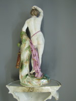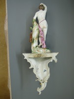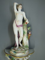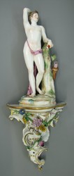 Die Farben sowohl der Konsolen wie der Figuren blass und nicht frühen Meissener Stücken entsprechend, insbesondere der Apoll mit blassbräunlichem und hellgrünem Baumstamm. Sehr unerfreulich. Fest verklebt. Marke wegen fester Verklebung von Konsole und Figur nicht kontrollierbar.