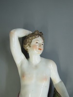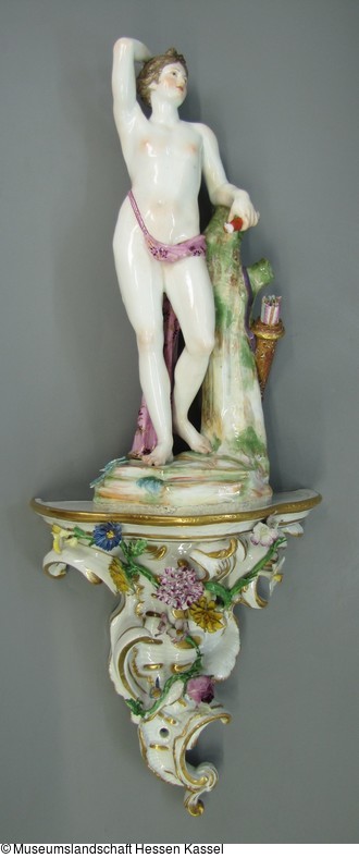 Gegenstück zur Venus. Mit rechtem Stand- und linkem Spilebein, den linken Arm auf einer Baumstütze, an welcher gefüllter Köcher hängt. Unbekleideter Körper voll nach vorn, Blick nach rechts gewandt. Rechte Hand auf dem Hinterkopf. Rosavioletter Mantel mit buntem Blumendekor nach hinten aggeglitten. Hautfarbe natürlich. Sockel wie vor. Bogen der linken Stilr.: Meissener Fabrikat. Künstler J. C. Schönheit.