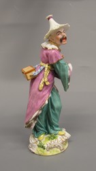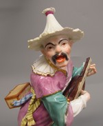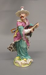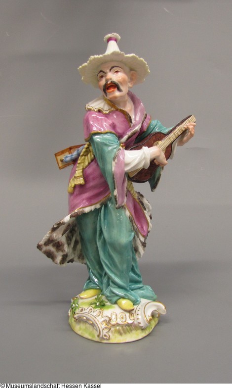 Hohler Natursockel mit Rocaillen belegt, dazwischen Pflanzenbüschel. Der Malabare in durch Bewegung flatterndem, innen pelzbesetztem Mantel, stellt den linken Fuss vor, hält die Laute weit nach links hinüber und wendet den Kopf mit geöffnetem Mund singend nach seiner rechten Seite. Farben: gelbgrün bis laubgrün, am Sockel Rocaillen in Weiß und Gold. Untergewand türkis mit blasspupurnem Futter. An den Ärmeln Mantel hellpurpur mit bräunlich weißem Futter, gelbe Schärpe mit braunen Streifen, ein am Gürtel hängendes Kästchen, heller und kräftiger bräunlich mit Goldverschluss, das Band blau und bläulich verlaufendes Weiß. Laute kräftig braun marmoriert, Gold am Steg und am Schalloch. Aus dem Sockel rückwärts herauswachsend kleine Baumstütze, die bis zur Schenkelhöhe reicht. Leichte Färbung in bräunliche und gelblichen Tönen mit grünem Laub.