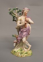 Flöteblasender Hirte auf Natursockel, am einen Eichbaum gelehnt, dessen Früchte übergross gebildet sind.