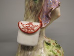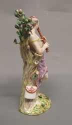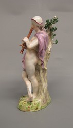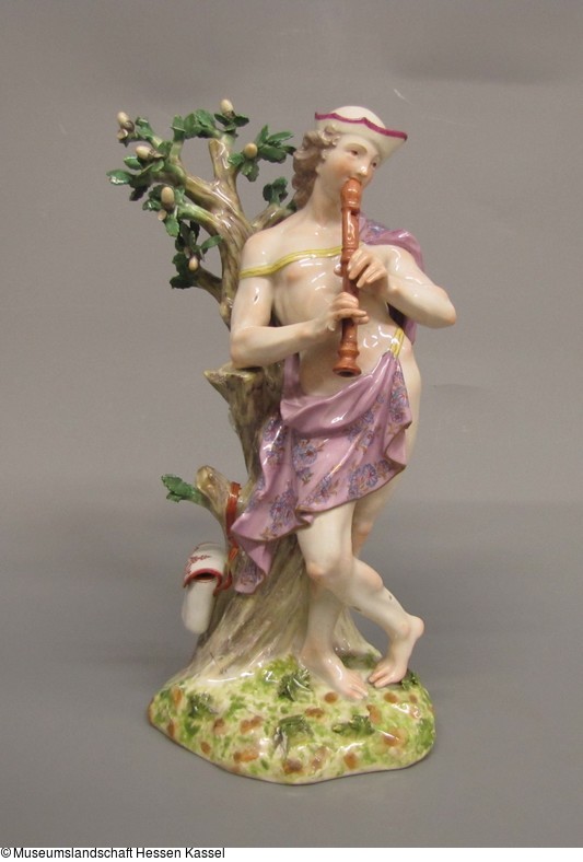 Linkes Stand- und etwas geziert übergeschlagenes rechtes Spielbein. Oberkörper geradeaus, Kopf nach links gewendet, die Hirtentasche über Baumstamm aufgehängt. Zweispitzhütchen nach links und bis über das linke Auge verschoben. einziges Kleidungsstück ein Mäntelchen, das durch ein Band zusammengehalten wird, dessen eines Ende an der linken Hüfte, dessen anderes Ende auf der linken Schulter ansetzt. Die Führung rückwärts unklar. Farben: hellfleckiger Natursockel in Wiesengrün und etwas dunklerem Laubgrün an den Blättern. Stamm bräunliches