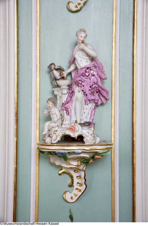 Frauengestalt im Idealgewand aus der Serie "Die fünf Sinne", stehend auf vierfüssigen Sockel aus reichstem Muschelwerk. Kontrapostische Bewegung, welche durch die Ausübung je eines der fünf Sinne charakterisiert wird. Die Ornamentik weiss mit Goldaufhöhung. Hautfarbe, voll-plastisch behandeltes Pflanzenwerk und Tiere in der Farbe naturalistisch.