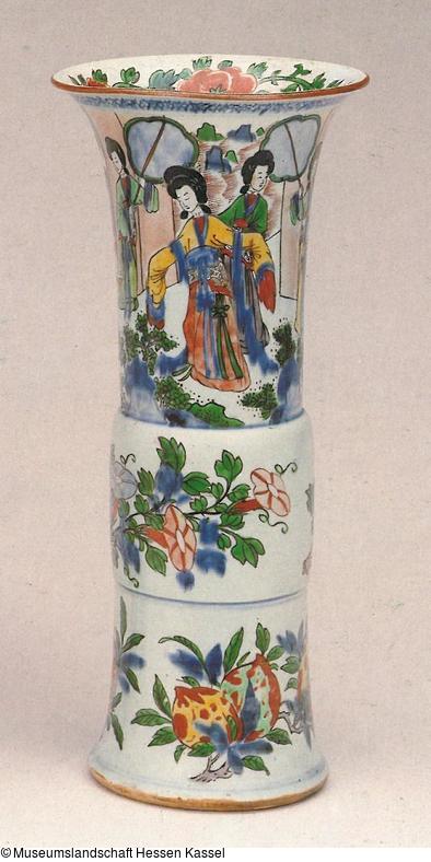 Hohe Flötenvase mit Schaftring. Beste Arbeit der sog. Famille verte mit großen Figurenszenen im oberen Teil, Blüten im Mittelteil und Pfirsich- und Granatapfelfüllung im Unterteil. Das Unterglasurblau hat die Neigung