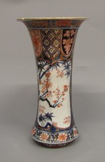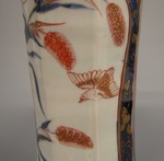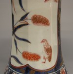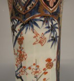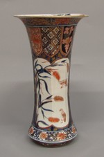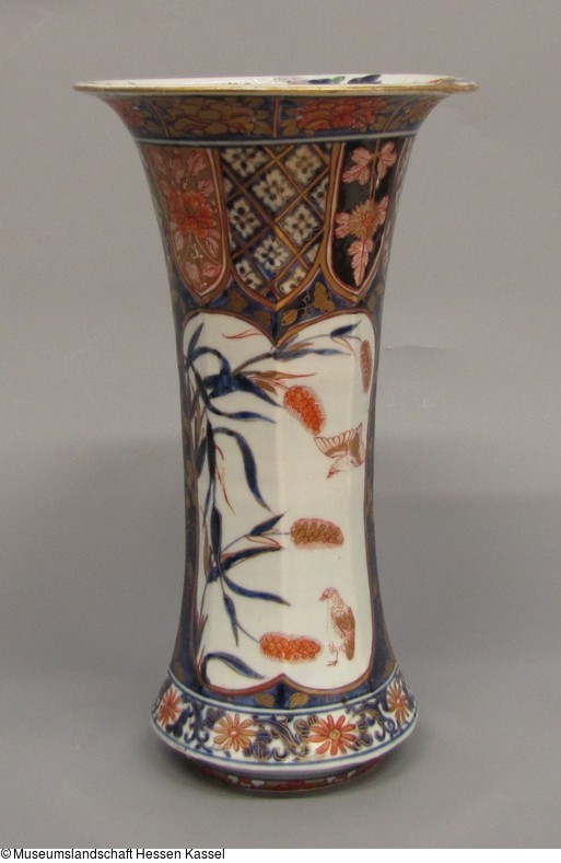 1 von 2 Stangenvasen. Hoher achteckiger Vasenkörper mit erweiterter Fußzone mit Profilring, über Umbruch einschwingend und leicht konisch hochgezogen zum weit ausladenden Rand. Der kurze Standring zeigt den in den Farben Rot-Gold gehaltenen ornamentalen Dekor. Der weiße Randstreifen auf dem Umbruch ist angefüllt mit goldenen und roten Chrysanthemen und ornamentalem Blattwerk in Blau. Die übrige Wandung hat einen blauen Fond mit aufgestreutem goldfarbenem Blattwerk. Zwei ausgesparte hohe Fächerreserven beleben die Fläche: Prunus, Bambus und Sperling sowie das berühmte Motiv ''Wachteln und Hirse''. Das erstere assoziiert den Frühling, während das Thema der Wachtel (Uzura) oft mit dem Herbst gleichgesetzt wird. Über der Reserven hängen lanzettförmige Ornamente herunter mit den Motiven ''Flower in tortoise shell'' auf blau-goldenem Fond sowie goldfarbene Chrysanthemen und Blätter auf schwarzem Fond und rote Päonien mit Blattwerk auf goldfarbenem Fond. Am ausgezogenen Kelchrand außen in jeder der acht Facetten rot-goldene Päonien auf blauem Fond. Auf der Innenseite locker ausgestreute Chrysanthemen und blühende Prunuszweige.