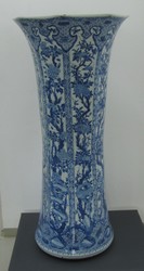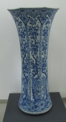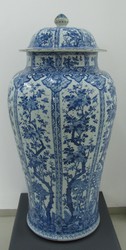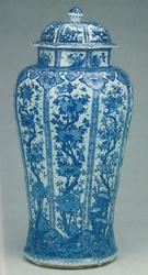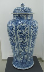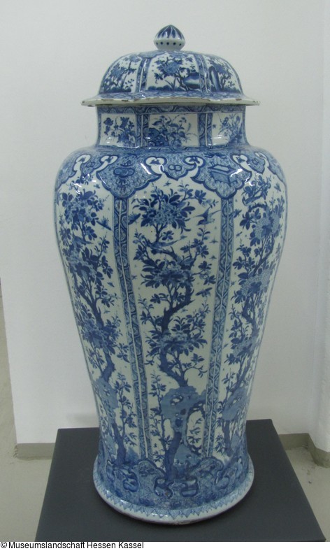 Monumentale Deckelvase, Hals und Deckel achtkantig, Rumpf rund verschliffen. Kobaltblaue Unterglasurmalerei auf Weiß. Vertikalabteilung in acht Felder, die sich auf Hals und Deckel fortsetzt. Die Felder naturalistisch bemalt mit blühenden Bäumen, fliegenden Vögeln u. Schmetterlingen in Verbindung mit Grottenwerk.- An Hals und Fußrand erhabener Vorhangfries, dessen Flächenmuster mit chinesischen Glückszeichen durchsetzt ist.