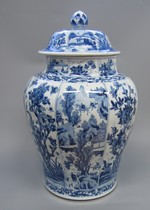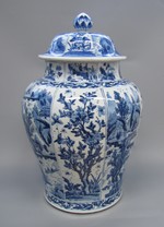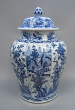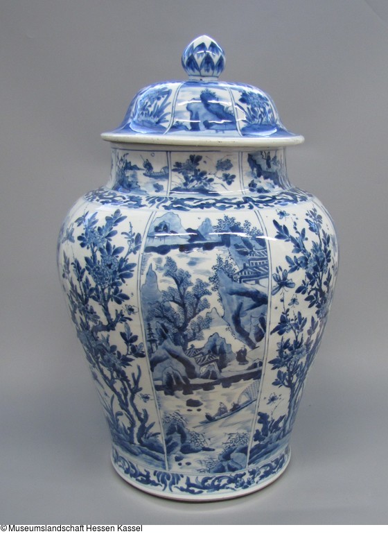 Unterer Rand Blattrankenmuster. Korpus geteilt in acht Felder, im Wechsel Landschaft mit Staffage u. Blütenzweigen. Übergang vom Korpus zum Hals Blattrankenmuster. Hals wieder acht Felder: im Wechsel kleine Landschaft mit Staffage u. Blütendekor. Deckel acht nahezu dreieckige Felder: im Wechsel Landschaft u. Blütendekor, zwiebelförmiger Knauf mit Zickzackmuster. Blauer Dekor. Delft